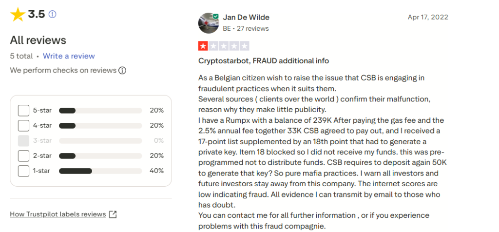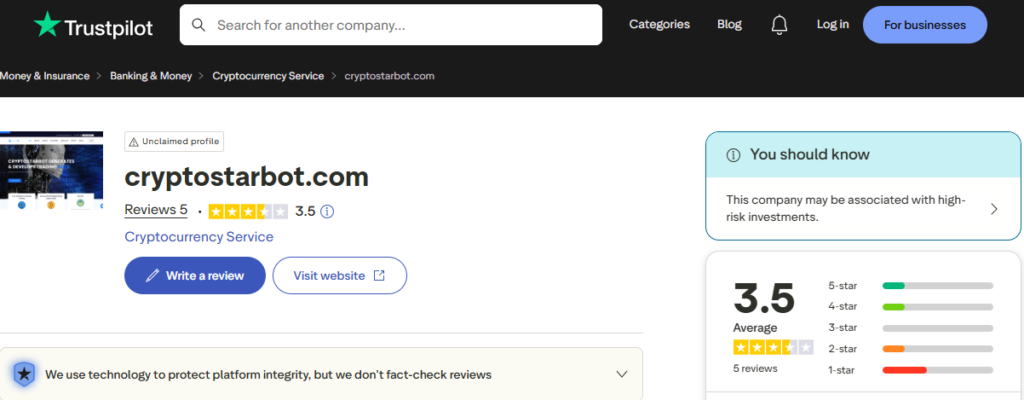 Cryptostarbot holds a Trustpilot score of 3.5 out of 5 — which sounds average until you look closer. Of the handful of reviews posted, some are explicitly negative. For a platform with minimal review volume, that proportion carries real weight. A low review count combined with negative feedback is not a sign of a growing, trustworthy service — it reflects unresolved user dissatisfaction and feeds into the broader pool of Cryptostarbot complaints circulating online.
